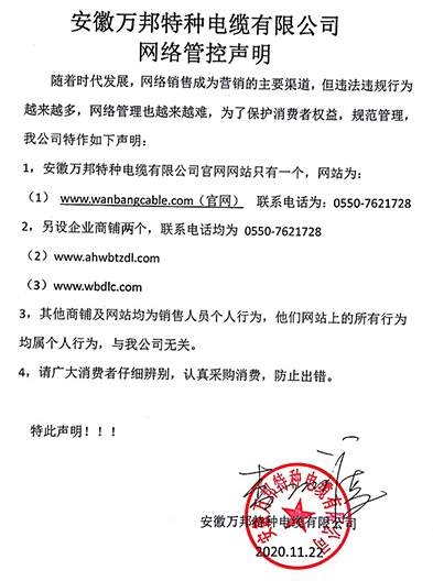 鄭重聲明:安徽萬邦特種電纜有限公司官方網站為:www_wanbangcable_com.fhzsw.cn,除此之外無任何子網站或合作網站,其余均為假冒偽劣。電話:0550-7621728 13485756353 地 址:安徽省天長市滁州高新技術產業開發區經四路29號